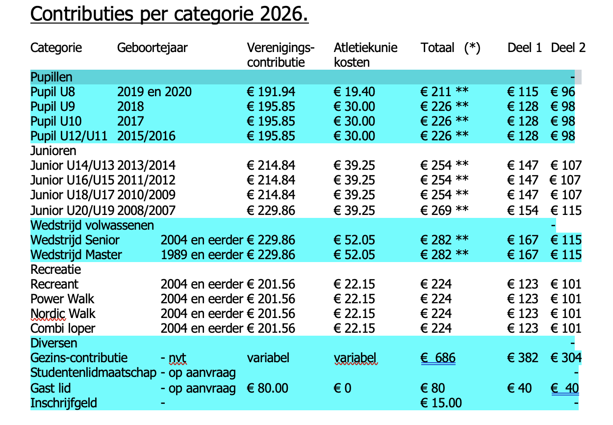 Aan de hand van de ingevulde gegevens wordt de categorie-indeling en daarmee de hoogte van de contributie bepaald. AV Pijnenburg volgt in 2026 onderstaande categorie-indeling van de Atletiekunie :