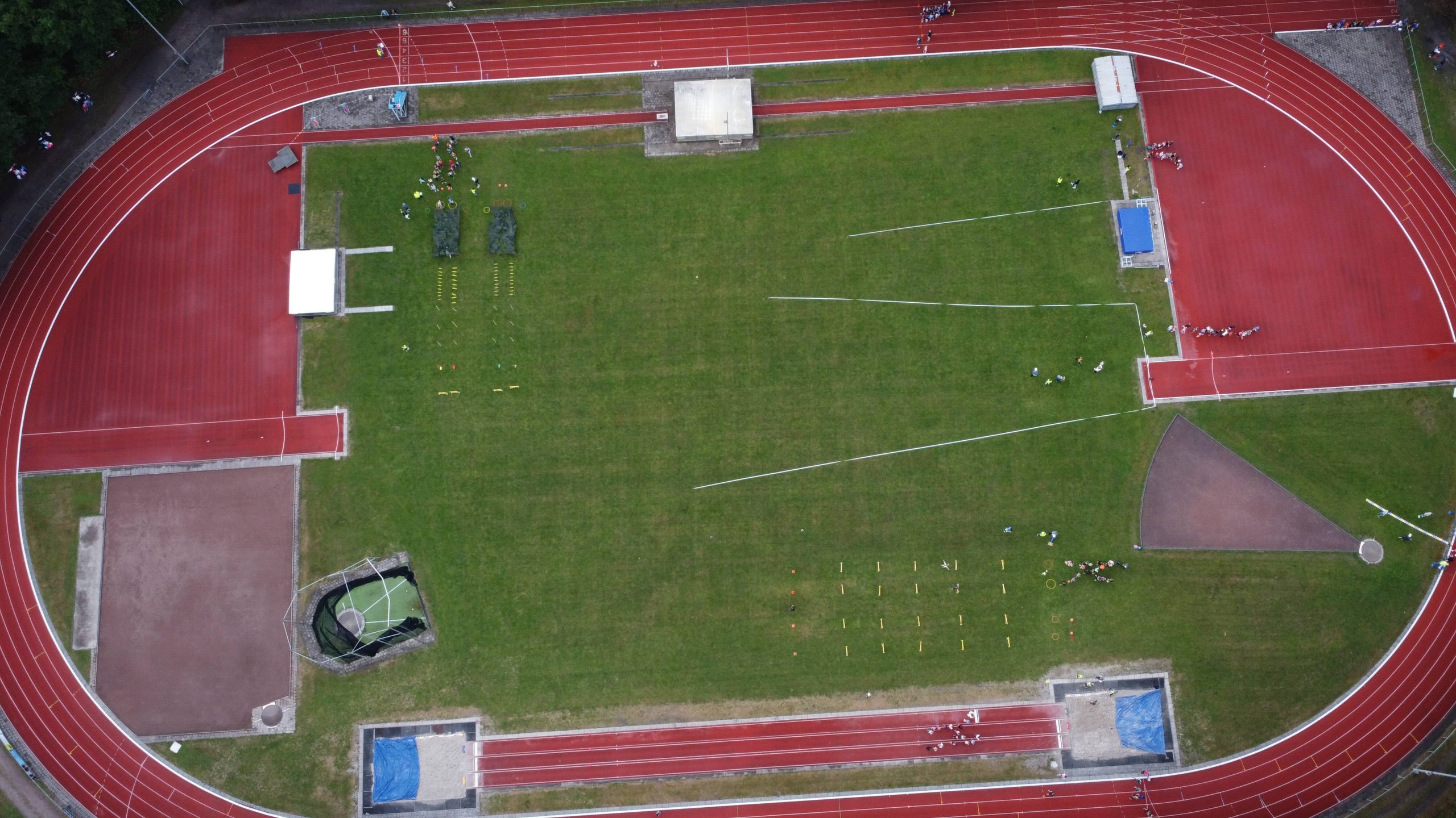 Dronebeeld van de atletiekbaan (foto: Marijn Keswiel)
